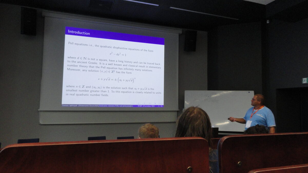 Miło nam również poinformować, że w sesji tematycznej “Teoria Liczb” wykład pt. „Sześcienne równanie Pella nad pierścieniami wielomianów i arytmetyka krzywych supereliptycznych” wygłosił dr hab. Tomasz Jędrzejak, prof. US z Instytutu Matematyki Uniwersytetu Szczecińskiego.
