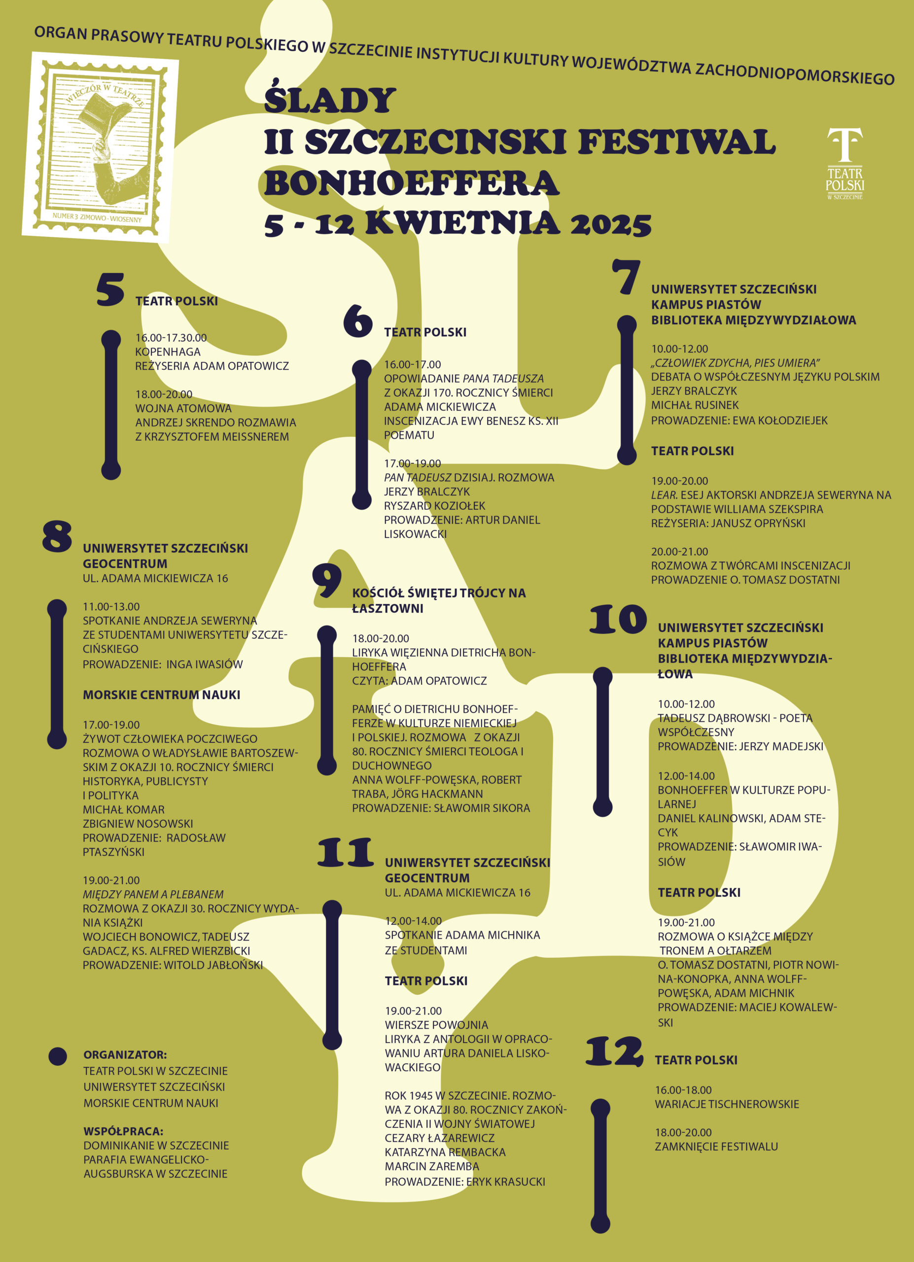 Po raz drugi Szczecin stanie się miejscem refleksji nad dziedzictwem Dietricha Bonhoeffera – wybitnego teologa, duchownego i działacza antynazistowskiego. II Szczeciński Festiwal Bonhoeffera „Ślady” odbędzie się w dniach 5-12 kwietnia 2025 roku, upamiętniając 80. rocznicę jego męczeńskiej śmierci. Szczególnie serdecznie zapraszamy  na otwarte wydarzenia, które odbędą się w murach Uniwersytetu Szczecińskiego.