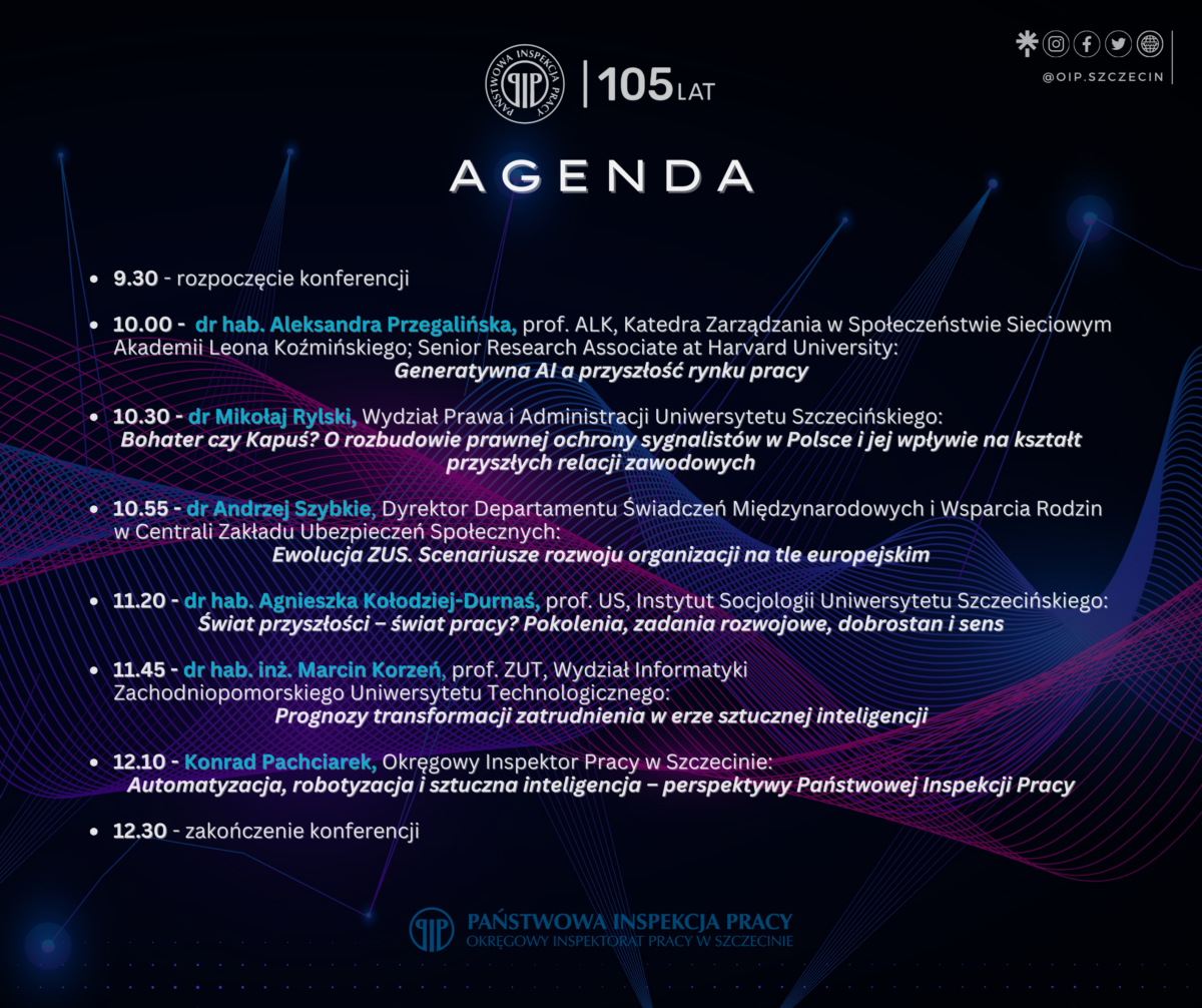 Podczas konferencji prelegenci postarają się odpowiedzieć m.in. na takie pytania, jak: Czy sztuczna inteligencja zastąpi człowieka? Czy sygnaliści są bohaterami? Jaka będzie inspekcja pracy w przyszłości?