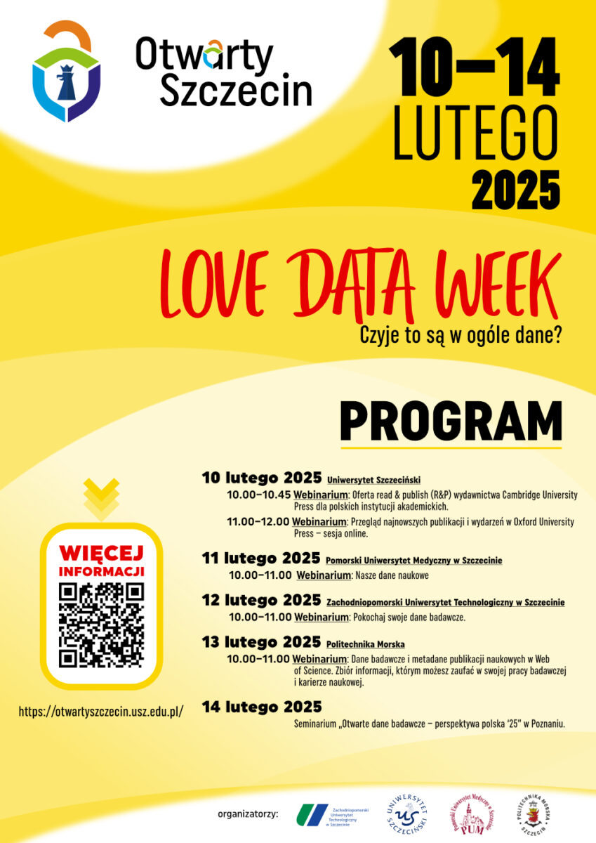 Zapraszamy na tegoroczną edycję Love Data Week 2025, która odbędzie się w dniach 10-14 lutego 2025 roku. Po raz kolejny wydarzenie organizowane jest we współpracy z największymi szczecińskimi uczelniami: Uniwersytetem Szczecińskim, Zachodniopomorskim Uniwersytetem Technologicznym, Pomorskim Uniwersytetem Medycznym oraz Politechniką Morską.