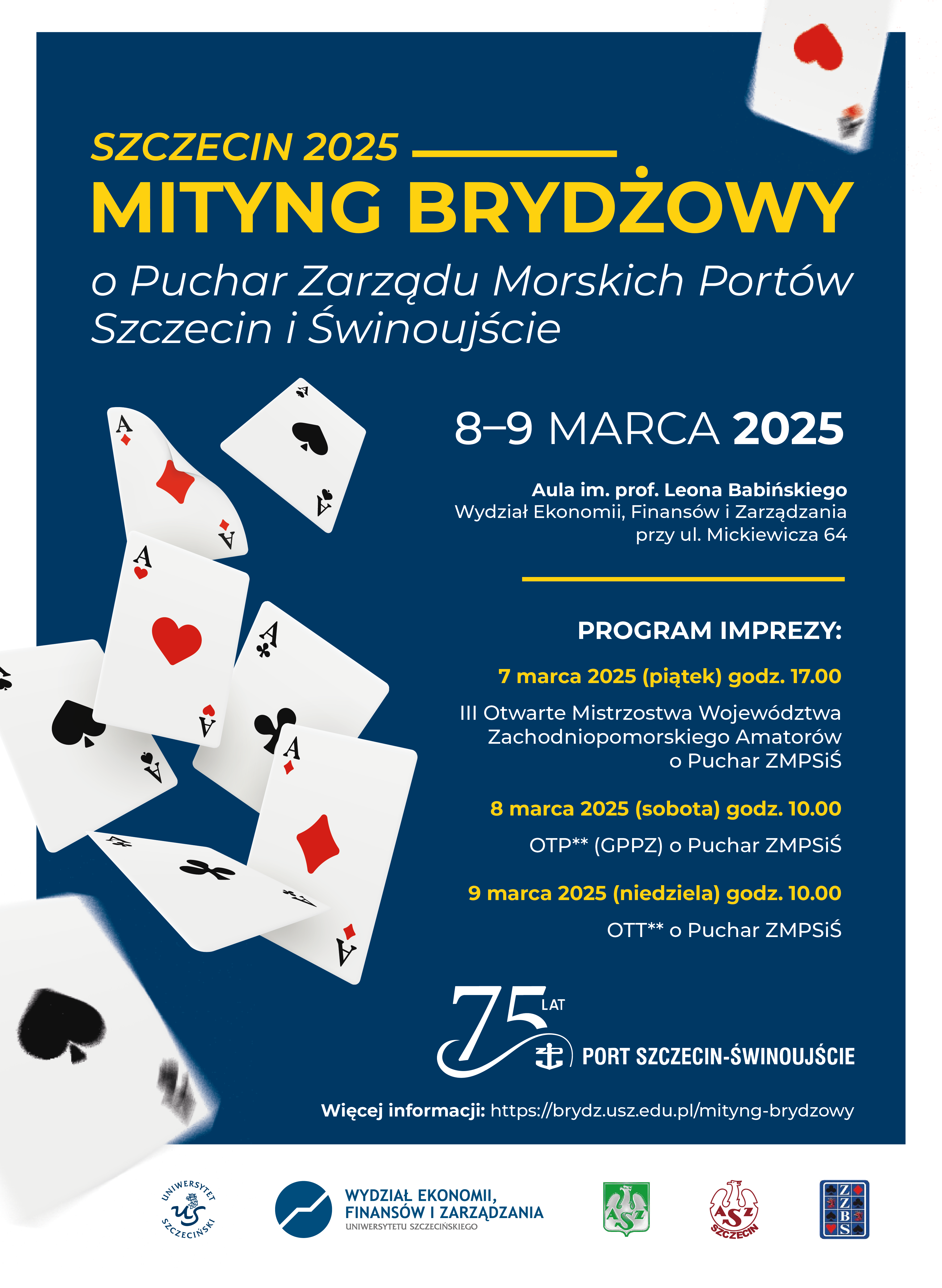 Informujemy, że w dniach 8-9 marca 2025 na Uniwersytecie Szczecińskim odbędzie się Mityng Brydżowy Szczecin 2025 o Puchar Zarządu Morskich Portów Szczecin i Świnoujście.