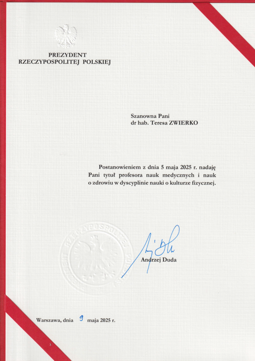 Z przyjemnością informujemy, że 30 lipca 2025 roku w Pałacu Prezydenckim prof. dr hab. Teresa Zwierko odebrała nominację profesorską z rąk Prezydenta Rzeczypospolitej Polskiej Andrzeja Dudy. Prof. dr hab. Teresa Zwierko otrzymała tytuł profesora nauk medycznych i nauk o zdrowiu w dyscyplinie nauki o kulturze fizycznej.