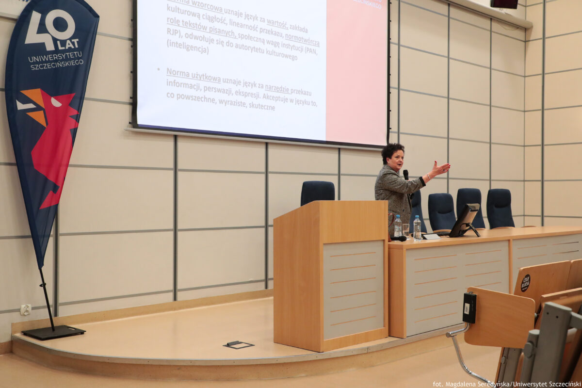 We wtorek 18 marca, w ramach cyklu Wykłady Mistrzów, odbyło się spotkanie z prof. dr hab. Ewą Kołodziejek, cenioną językoznawczynią i autorytetem w dziedzinie poprawności językowej. Wykład zatytułowany „Poprawna? Stosowna? Prosta? Jakiej polszczyzny potrzebujemy?” dostarczył uczestnikom cennych refleksji na temat współczesnej polszczyzny, jej norm, zmian oraz roli języka w codziennej komunikacji.