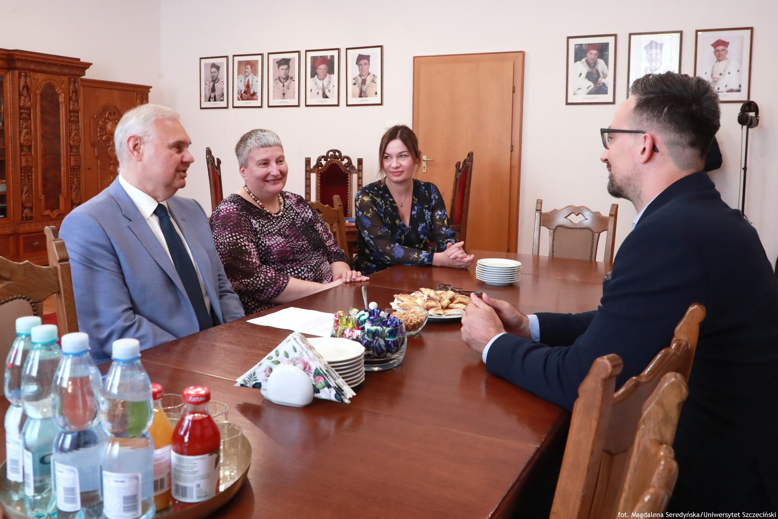 W spotkaniu uczestniczyli: prof. dr hab. Waldemar Tarczyński – Rektor Uniwersytetu Szczecińskiego, dr hab. Kinga Flaga-Gieruszyńska, prof. US – Prorektor ds. Organizacji US, Pani Agnieszka Lizak – Rzeczniczka US oraz Pan Mateusz Podbielski – Prezes Zarządu Fundacji Turing AI.