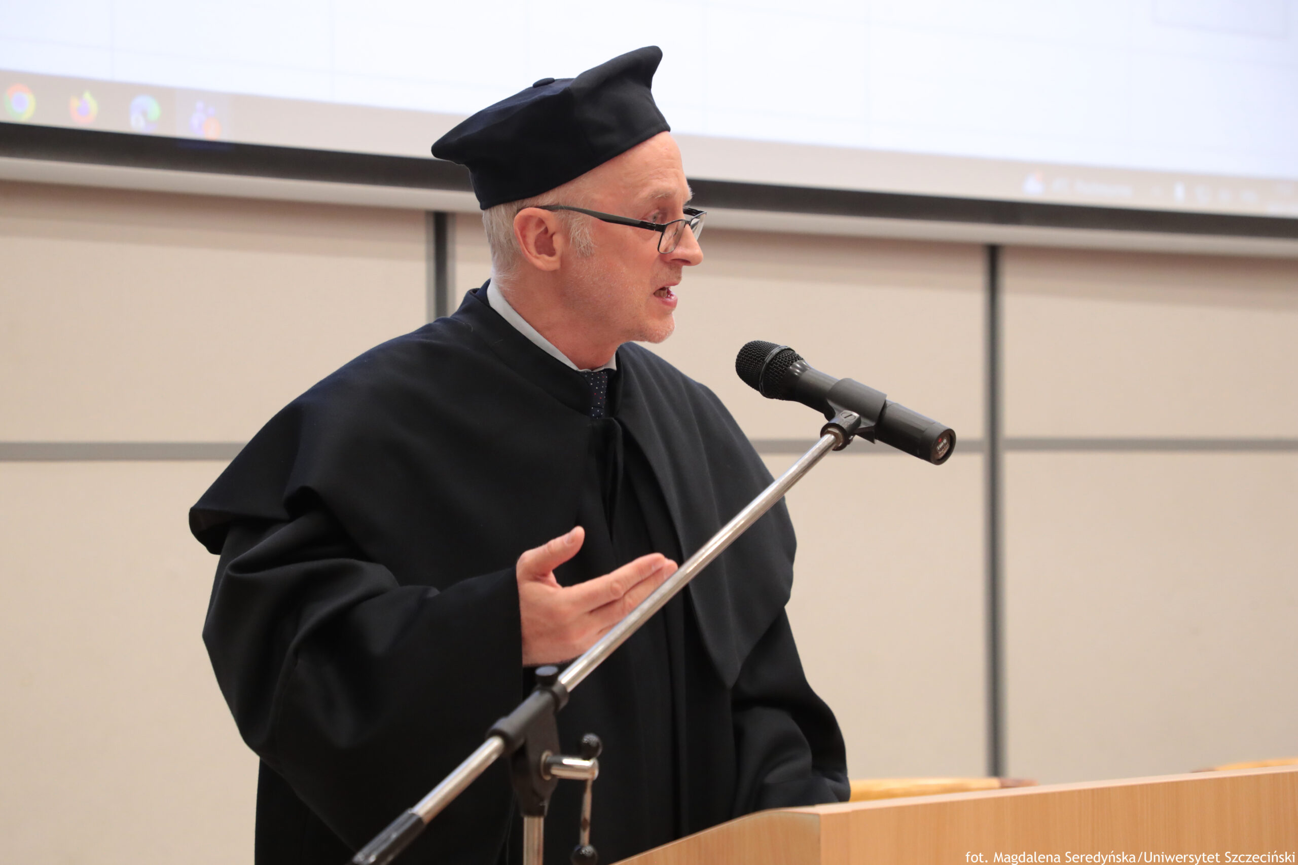 „W imieniu studentów XXXV edycji studiów MBA oraz wcześniejszych edycji składamy Państwu najserdeczniejsze podziękowania za czas, wiedzę i uważność, które towarzyszyły nam przez całą tę drogę. Dziękujemy Wykładowcom za wymagania, które mobilizowały, za praktyczne spojrzenie, które porządkowało chaos, i za inspirację, która zostaje na długo po ostatnich zajęciach. Dziękujemy za dyscyplinę myślenia, którą Państwo w nas budowali: za pytania trudniejsze niż odpowiedzi, za konsekwencję w dochodzeniu do sedna, za pokazywanie, że w zarządzaniu nie ma magii, jest metoda, odpowiedzialność i odwaga wyboru. W sposób szczególny składamy podziękowania Kierownikowi studiów podyplomowych MBA, prof. dr hab. Dariuszowi Zarzeckiemu, za merytoryczne przywództwo, konsekwencję w utrzymywaniu wysokich standardów oraz za stworzenie programu, który realnie rozwija i wymaga. Dziękujemy za jasny kierunek, za dbałość o jakość i za to, że pod Pańskim kierownictwem te studia były czymś więcej niż cyklem zajęć — były doświadczeniem formującym. Z całego serca dziękujemy również Kadrze sekretariatu za cierpliwość, sprawność i dyskretną troskę o to, aby wszystko „działało” wtedy, gdy my byliśmy pochłonięci projektami, zaliczeniami i terminami. Za życzliwość w sprawach drobnych, które w rzeczywistości były dla nas kluczowe: za szybkie odpowiedzi, porządek w formalnościach, spokój wtedy, gdy nam go brakowało, i pewność, że po drugiej stronie zawsze jest ktoś, kto naprawdę chce pomóc. Dziękujemy za kulturę organizacyjną, którą Państwo współtworzyli każdego dnia — tę niewidoczną, ale fundamentalną, bo bez niej żaden program, nawet najlepszy, nie miałby takiej jakości. Te studia miały dla nas wagę większą niż dyplom. Były próbą charakteru, szkołą decyzji i miejscem, w którym ambicja spotkała się z odpowiedzialnością. Nauczyliśmy się rozumieć liczby, procesy i strategie, ale równie mocno nauczyliśmy się rozumieć konsekwencje: dla ludzi, dla zespołów, dla organizacji i dla nas samych. Wielu z nas przyszło tu po kompetencje, a wychodzi z poczuciem, że najważniejszą zmianą jest sposób myślenia — bardziej krytyczny, bardziej uporządkowany, ale też bardziej pokorny wobec złożoności świata.”