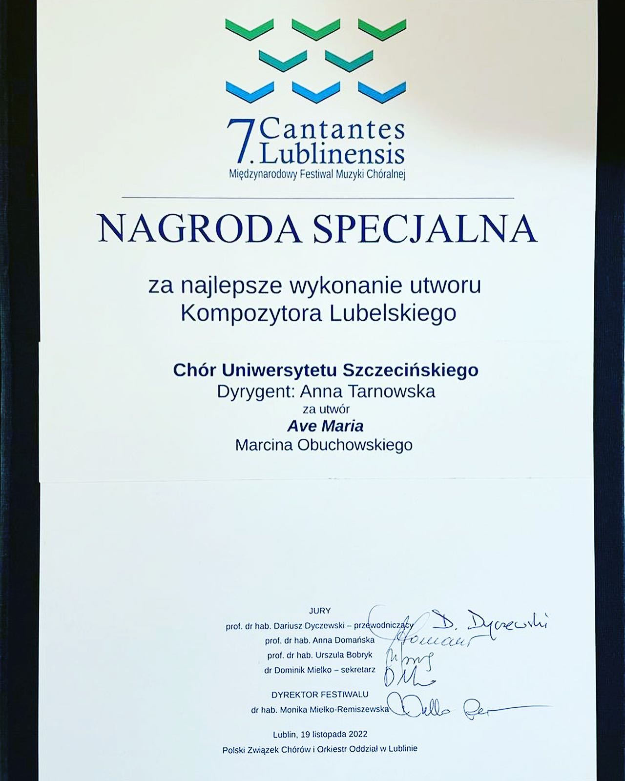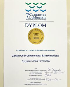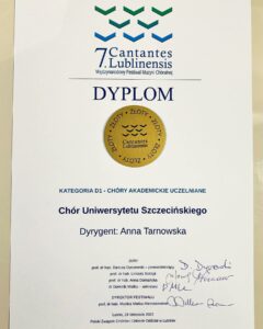 Z radością informujemy, że Chór Uniwersytetu Szczecińskiego pod dyrekcją dr hab. Anny Tarnowskiej, ma na koncie kolejne sukcesy – Dwa Złote Dyplomy i Nagrodę Specjalną. Zespół w dniach 18-19 listopada 2022 roku występował na 7. Cantantens Lublinensis – Międzynarodowym Konkursie Chóralnym w Lublinie.