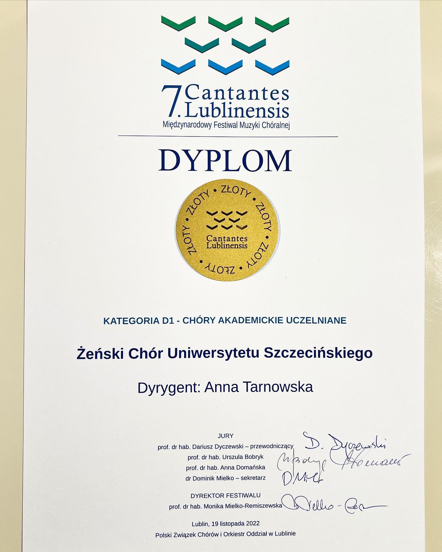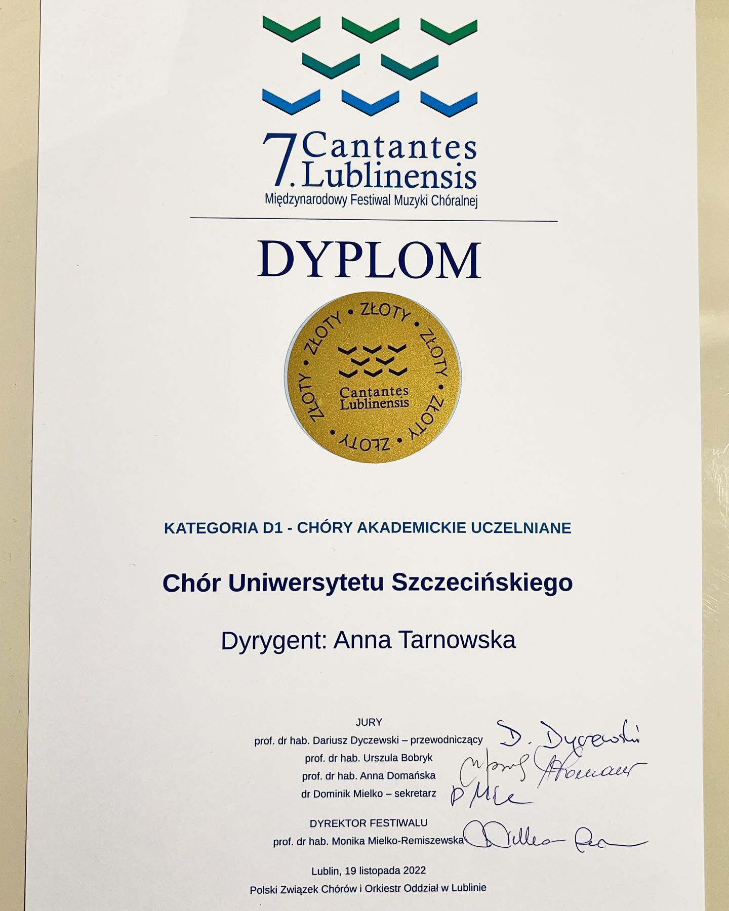 - ZŁOTY DYPLOM w kategorii Chóry Akademickie Uczelniane dla Chóru Mieszanego US,