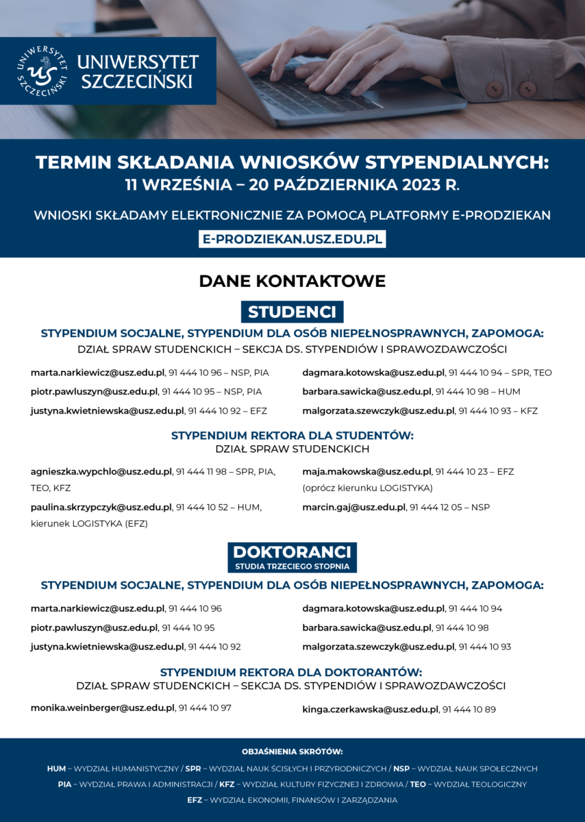 Informujemy, że do 20 października 2023 r. studenci Uniwersytetu Szczecińskiego mogą składać wnioski o świadczenia z funduszu stypendialnego: stypendium socjalne, stypendium dla osób niepełnosprawnych, stypendium rektora i zapomoga, na rok akademicki 2023/2024.