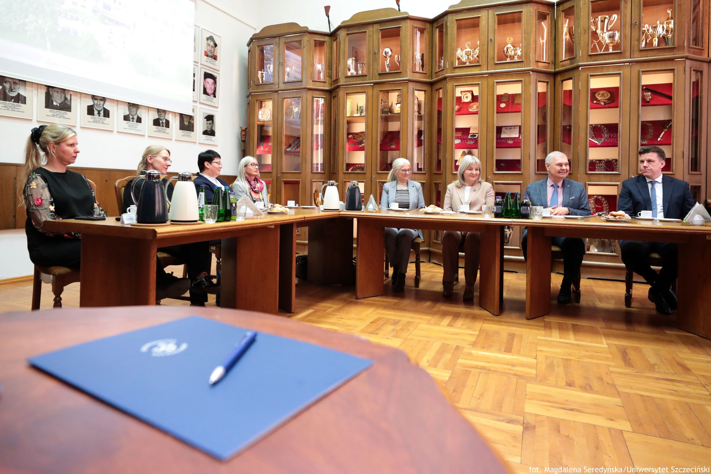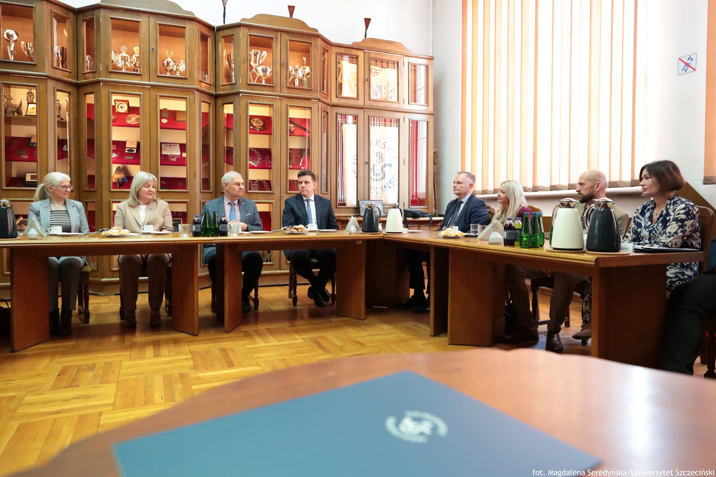 Ze strony gości w spotkaniu wzięli udział: Izabela Zawadzka – Dyrektor Izby Administracji Skarbowej w Szczecinie, Małgorzata Brzoza – Zastępca Dyrektora Izby Administracji Skarbowej w Szczecinie, Grzegorz Gralak – Naczelnik Zachodniopomorskiego Urzędu Celno-Skarbowego w Szczecinie, Marta Lasek-Skalik – Koordynator porozumienia po stronie Izby i Sebastian Osiński – Rzecznik Prasowy.