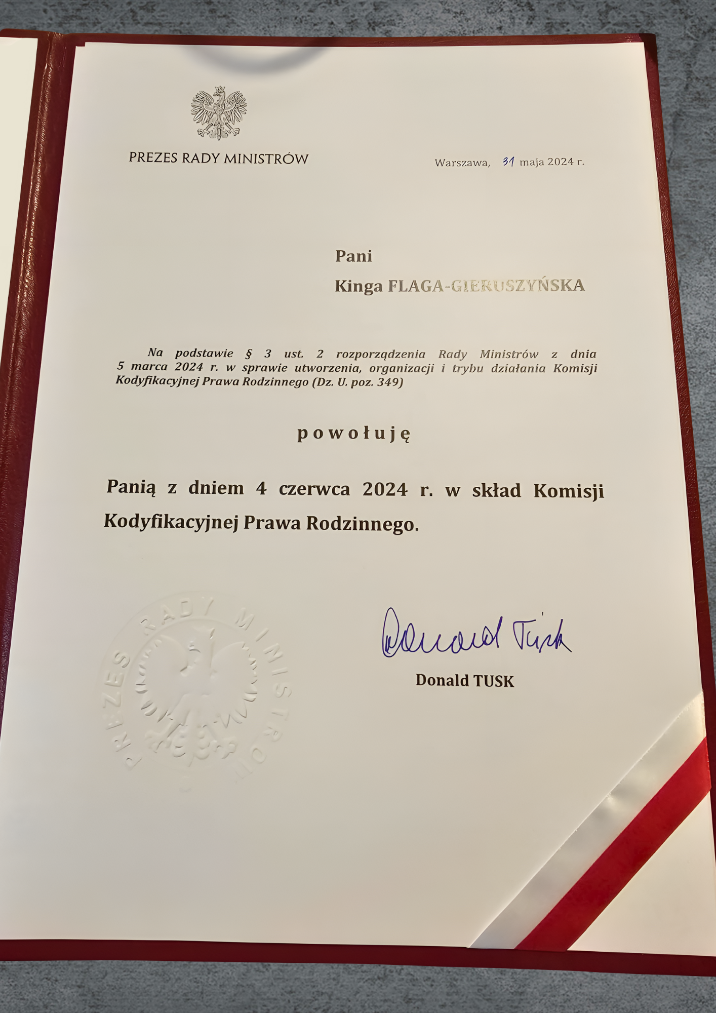 Z radością informujemy, że 4 czerwca br. Prezes Rady Ministrów Donald Tusk, na wniosek Ministra Sprawiedliwości Adama Bodnara, powołał na członka Komisji Kodyfikacyjnej Prawa Rodzinnego  Panią dr hab. Kingę Flagę-Gieruszyńską, prof. US, Prorektor ds. Organizacji Uniwersytetu Szczecińskiego.