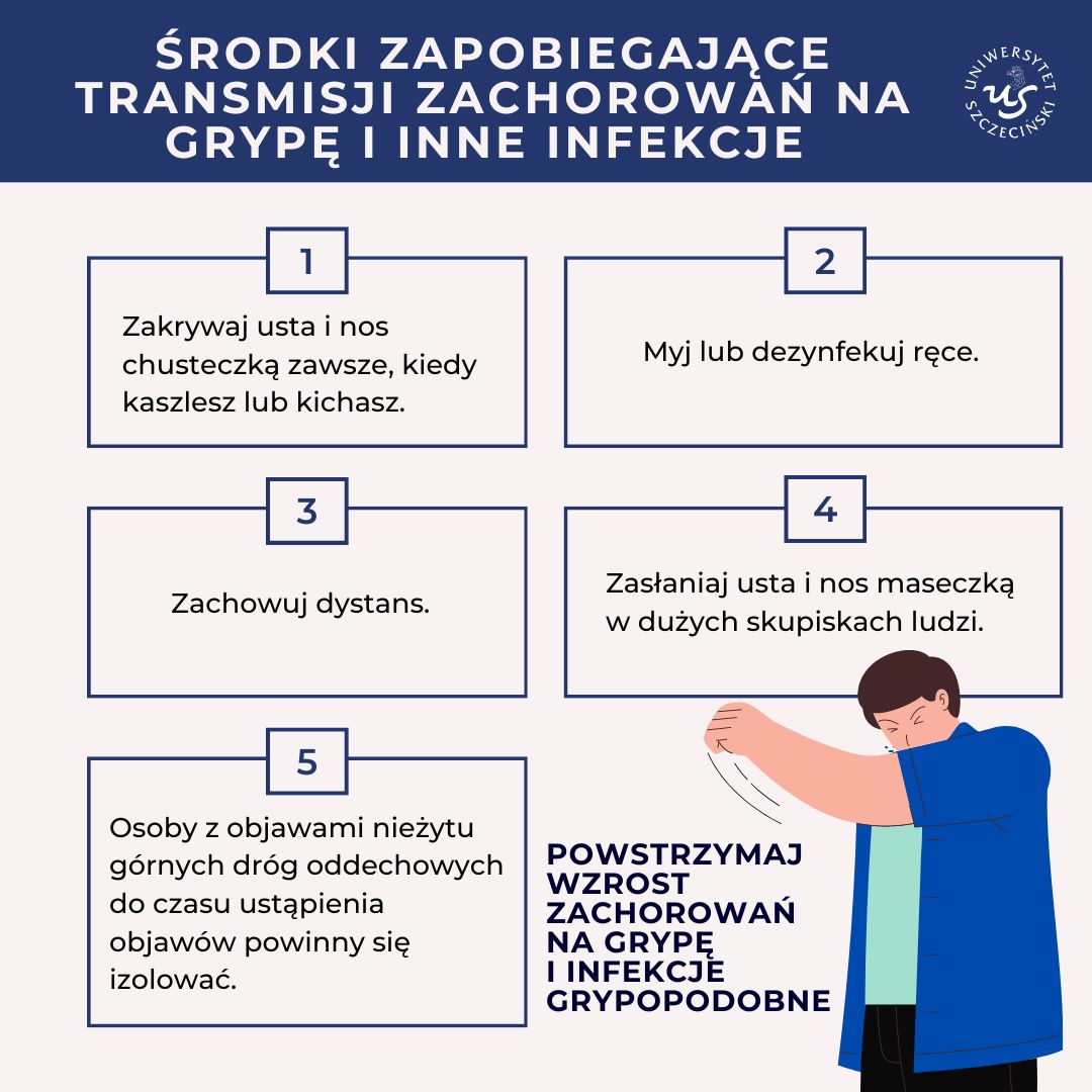 W związku ze wzrostem zachorowań na grypę i infekcje grypopodobne oraz spodziewanym dalszym wzrostem zakażeń wywołujących choroby układu oddechowego Rektor Uniwersytetu Szczecińskiego otrzymał od Państwowego Powiatowego Inspektora Sanitarnego w Szczecinie zalecenie wskazujące na konieczność wdrożenia i utrzymania środków zapobiegających transmisji zakażeń przenoszonych drogą powietrzno-kropelkową, jak również przez kontakt bezpośredni.
