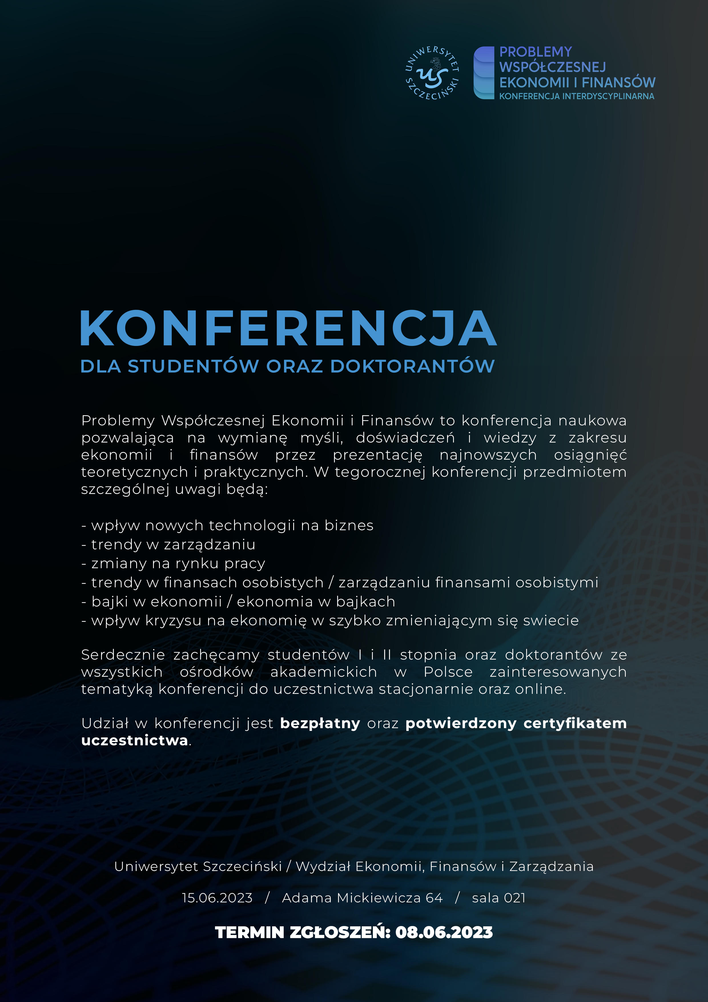 Koło Analiz Gospodarczych działające w Katedrze Ekonomii Instytutu Ekonomii i Finansów Uniwersytetu Szczecińskiego, zaprasza do udziału w konferencji „Problemy współczesnej ekonomii i finansów. Ujęcie interdyscyplinarne”, która odbędzie się 15 czerwca 2023 roku.