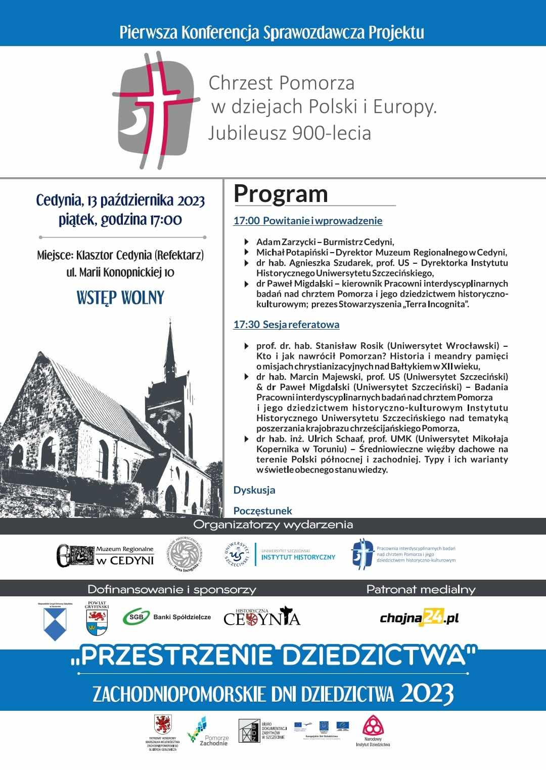 Już w najbliższy piątek zapraszamy na I Konferencję Sprawozdawczą Projektu „Chrzest Pomorza w dziejach Polski i Europy. Jubileusz 900-lecia”, która odbędzie się w historycznej Cedyni 13 października 2023 r. w Klasztorze Cedynia, ul. M. Konopnickiej 10.
