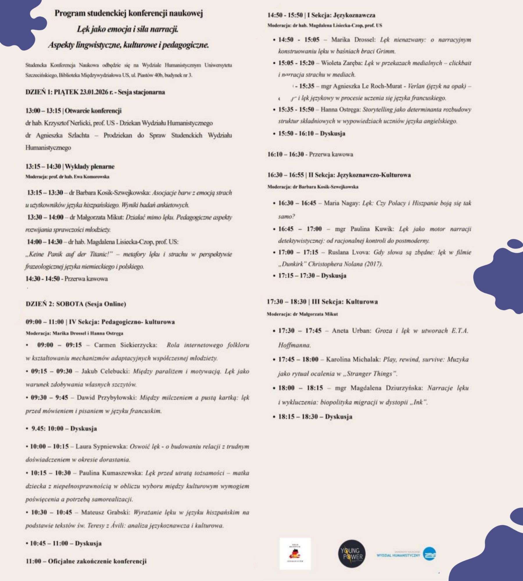 Zapraszamy do udziału w studenckiej konferencji naukowej „Lęk jako emocja i siła narracji. Aspekty lingwistyczne, kulturowe i pedagogiczne”, organizowanej przez Koło Naukowe Pedagogów Młodzieży „Young Power” (Instytut Pedagogiki US) oraz Koło Naukowe Młodych Germanistów (Instytut Językoznawstwa US).